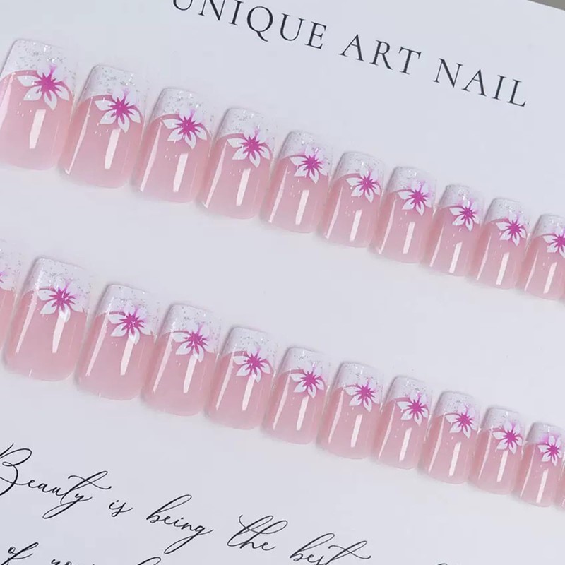 French Tip Press on Nails Medium Square Fake Nails Pink Flowers False Nails S...