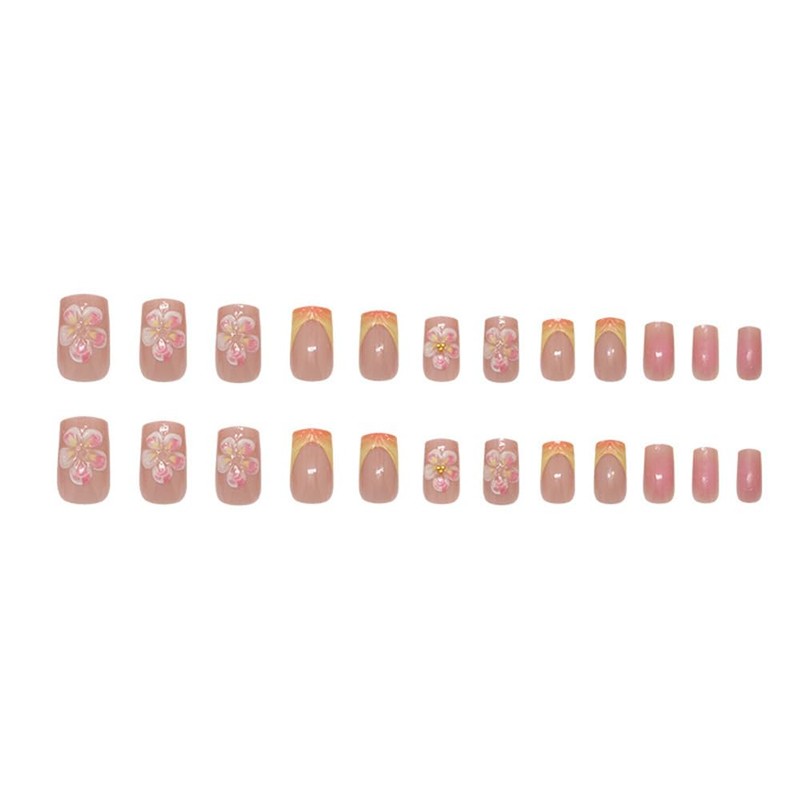 - Flower Fake Nails Kit: 24Pcs medium square press on nails, 24 pieces of jelly glue, 1 mini nail file, 1 wooden stick. (Durability of jelly glue is not as good as liquid glue, but it makes spring artificial nails . Please use your suitable glue according to different scenes)