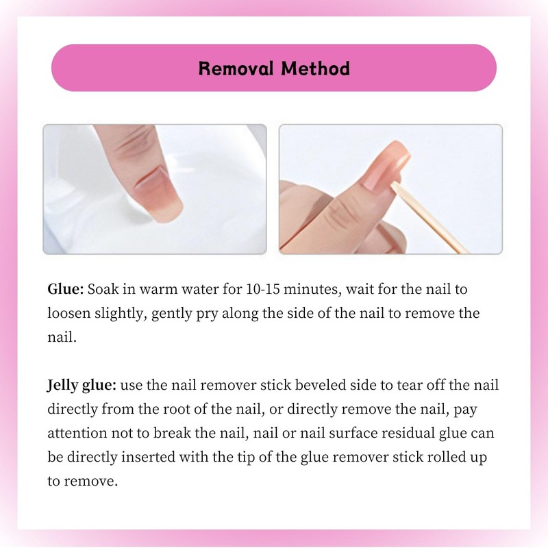 Gentle Removal: Soak in warm water 10-15 minutes (for glue) or peel gently (jelly glue) without damaging natural nails.