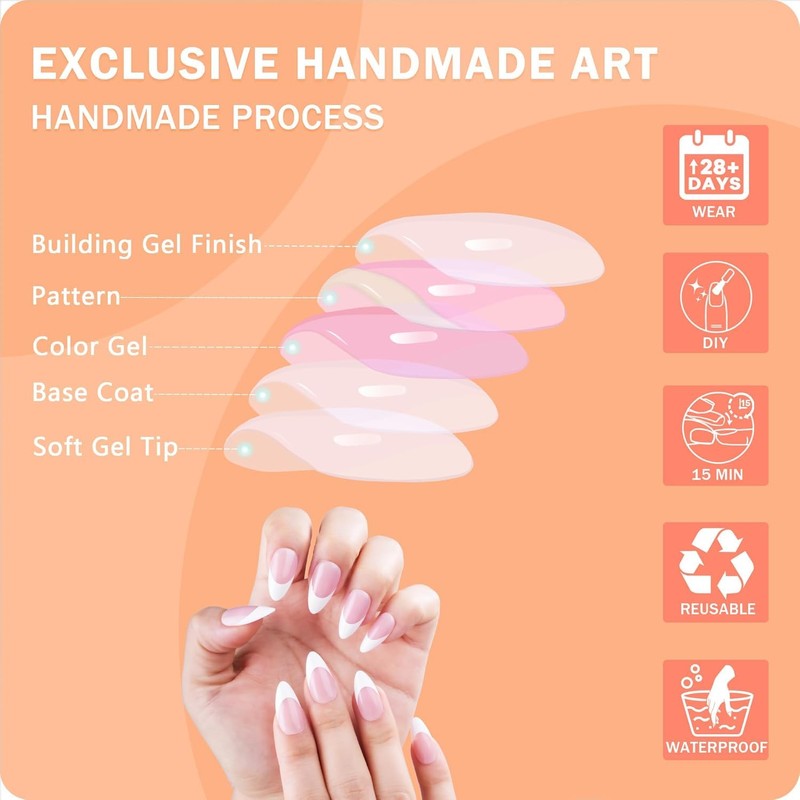 • ???LONG-LASTING DURABILITY??Our press on nails are designed for durability. The short French almond press on nails stay beautiful for up to 28 days when applied following our tutorial, ensuring stunning and resilient nails for any event.