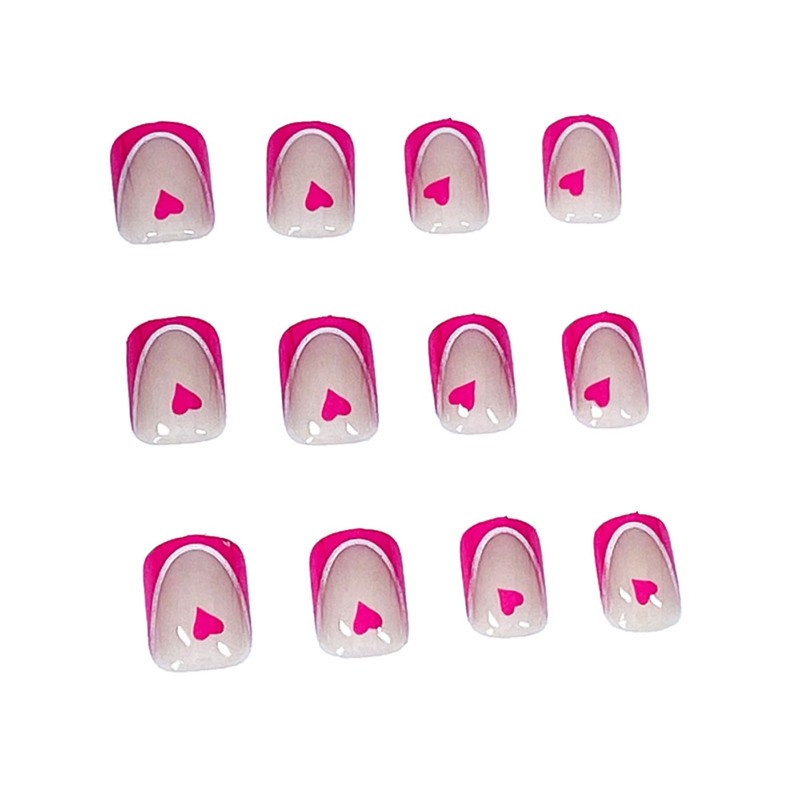 French Tip Press on Nails Short Fake Nails with Designs Glossy Valentines False Nails Heart Nails Press on Acrylic Nails Hot Pink Stick on Nails Press ons Heart Square Glue on Nails for Women 24Pcs
