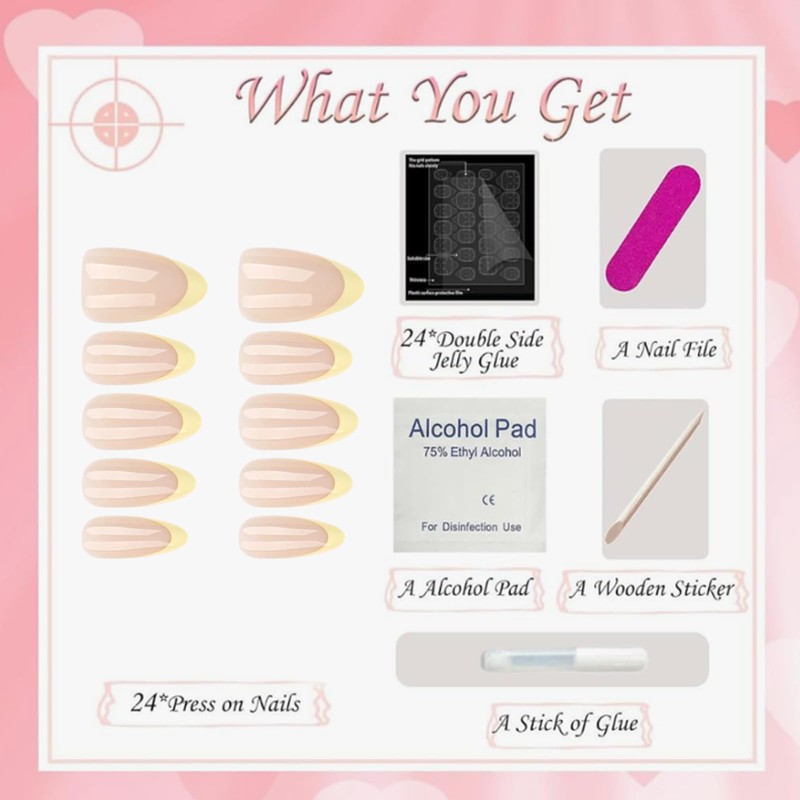 - 【Yellow-edge French Fake Nails】These yellow-edge nude pink French press-on nails are the perfect spring/summer accessory, blending sweet, cute, and elegant vibes. The natural-looking design complements all skin tones and hand shapes, creating a soft, feminine look that’s effortlessly chic.