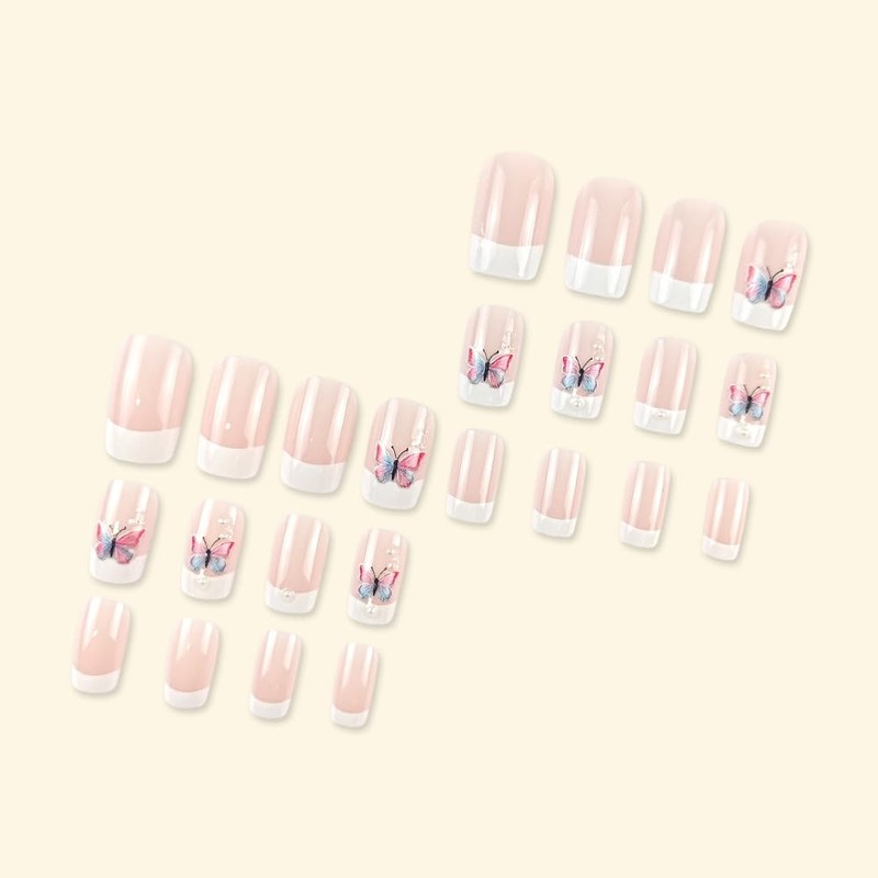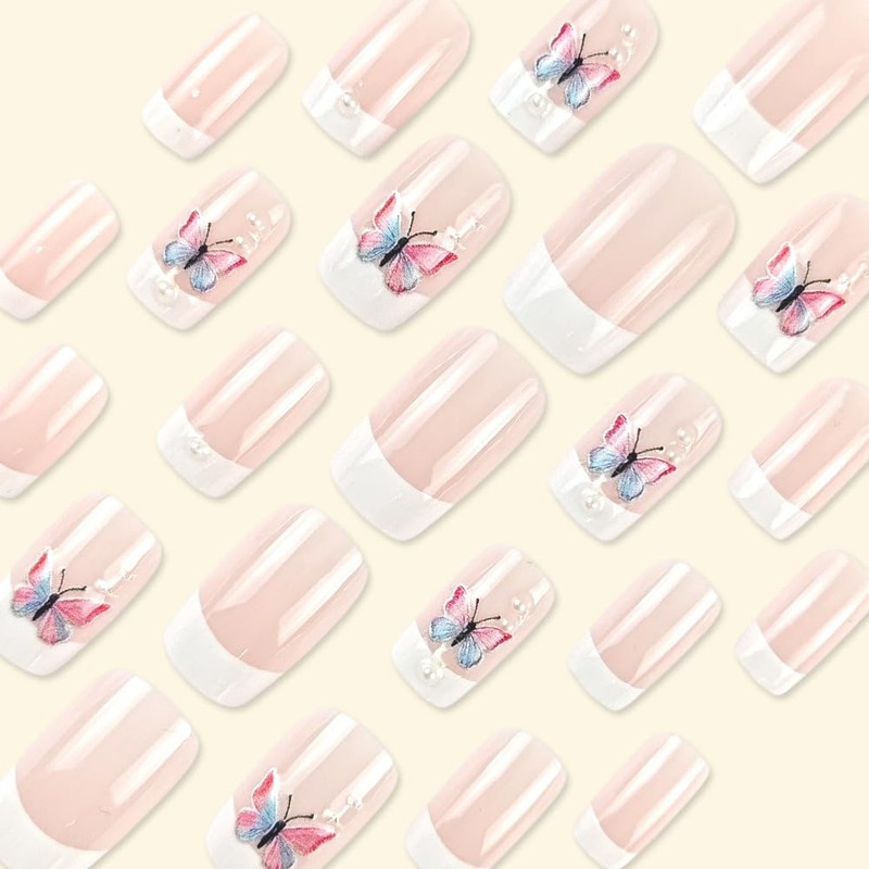 French Tip Press on Nails Short Square Fake Nails with Butterfly Designs White False Nails Pearl Artificial Nails Stick on Nails for Women 24pcs