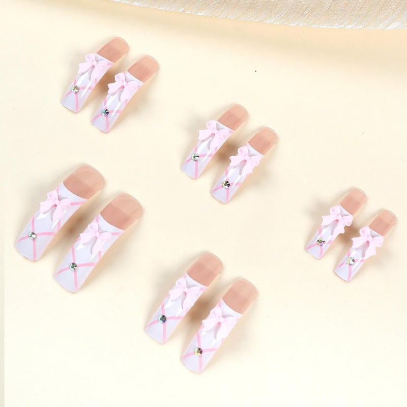 French Tip Press on Nails with Pink Bow Rhinestones Designs Curved Press on N...