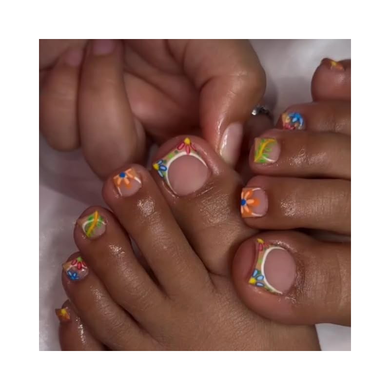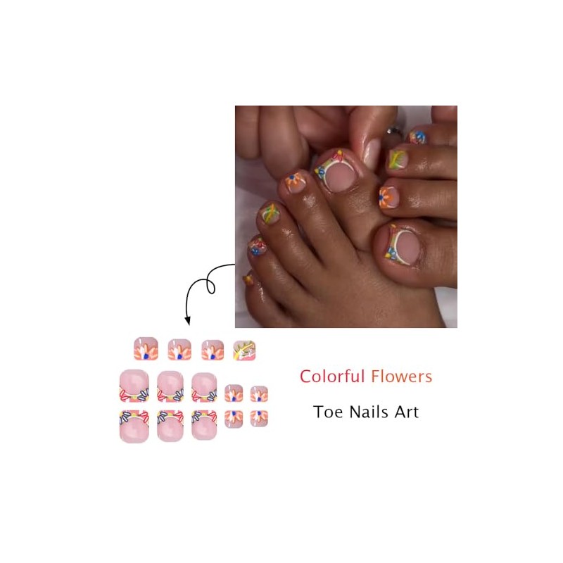 French Tip Press on Toe Nails Spring Fake Toenails with Colorful Flowers Designs Nude Pink False Toe Nails Flowers Glue on Toenails Summer Stick on Toe Nails Cute Acrylic Toenails Artificial Toenails