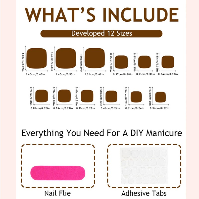 - Package Contents: You will get 24 pieces cute press on toenails, 1 mini nail file, 1 small wooden stick, 24 jelly glue stickers. You can safely choose a fake toenails that fits your toe size and DIY your desired nail shape