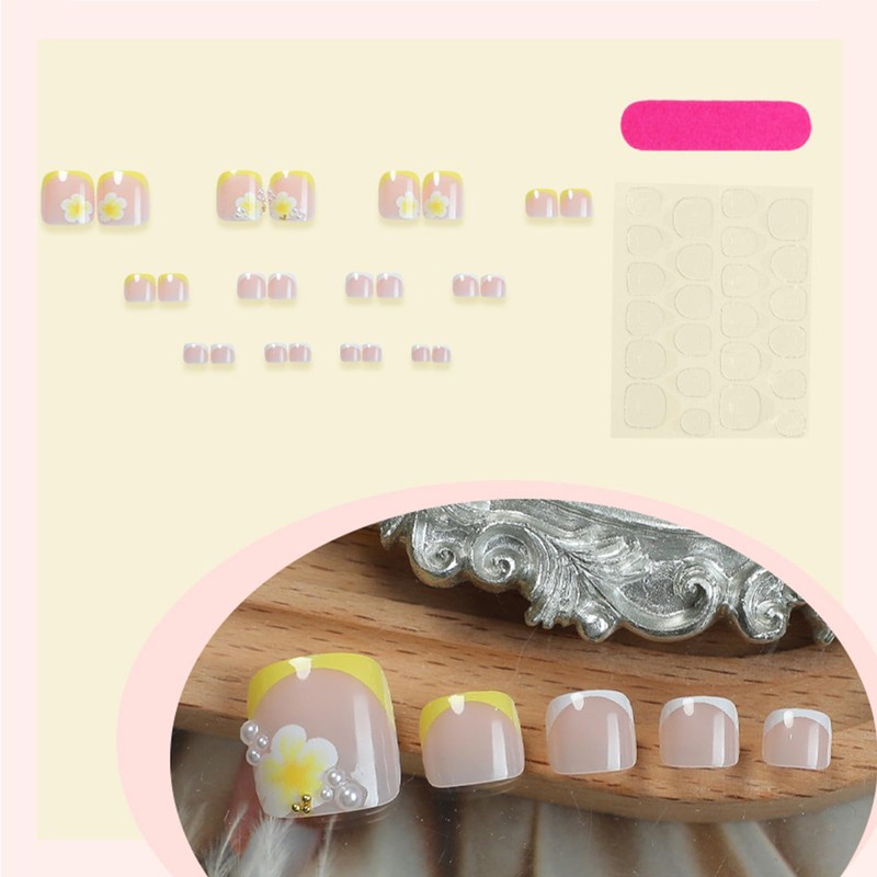 French Tip Press on Toenails Short Square Fake Toe Nails with Designs Pearl Gel Glue on Nails Yellow Flower False Toenails Summer Cute Artificial Toe Nails Stick on Toenails for Women