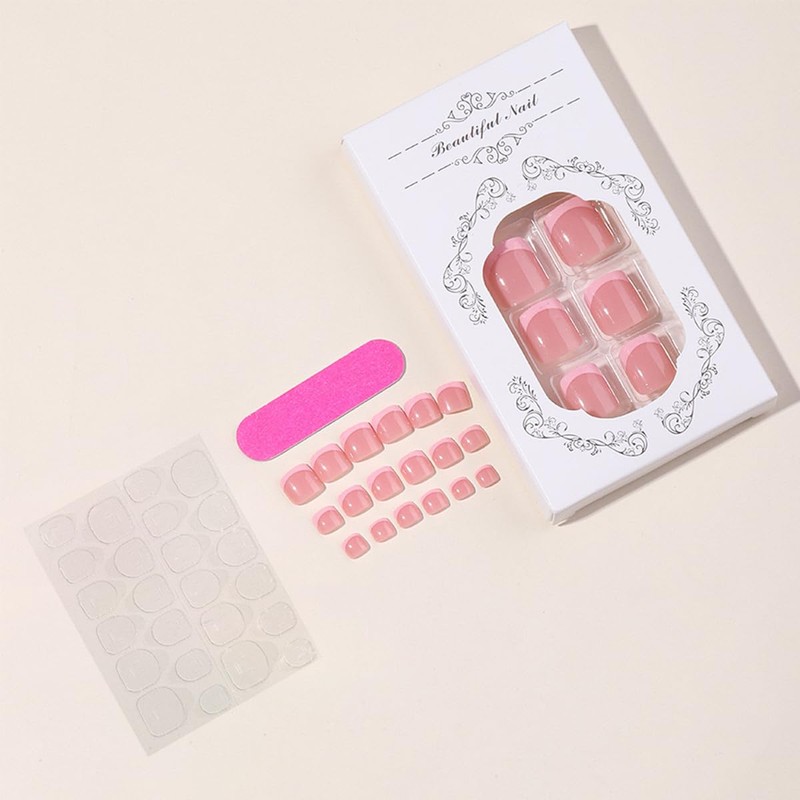 - French tip False Toenails : contains 24 pieces of square press on toenails short, 12 different sizes, 1 mini nail file, 24 pieces of jelly glue, 1 alcohol pad, 1 wooden stick. you can choose the most suitable false toenails according to the size and width of your toenails.