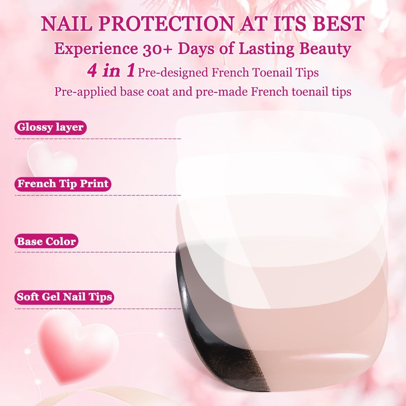 - ULTRA FIT DESIGN: French Gel X Toe nail tips are meticulously contoured to fit your nails perfectly, seamlessly extending from the cuticle to the free edge. Each nail exhibits a tapered design toward the cuticle, ensuring the most natural and flawless appearance