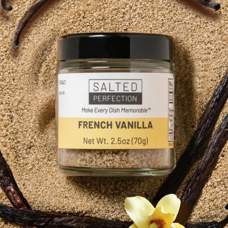 - The French Vanilla Flavored Gourmet Finishing Sea Salt by Salted Perfection is a true gourmet delight. Transport your senses to the tropical haven of Madagascar with this exquisite blend of fine sea salt flakes and ground vanilla bean. Simple ingredients, complex flavor.