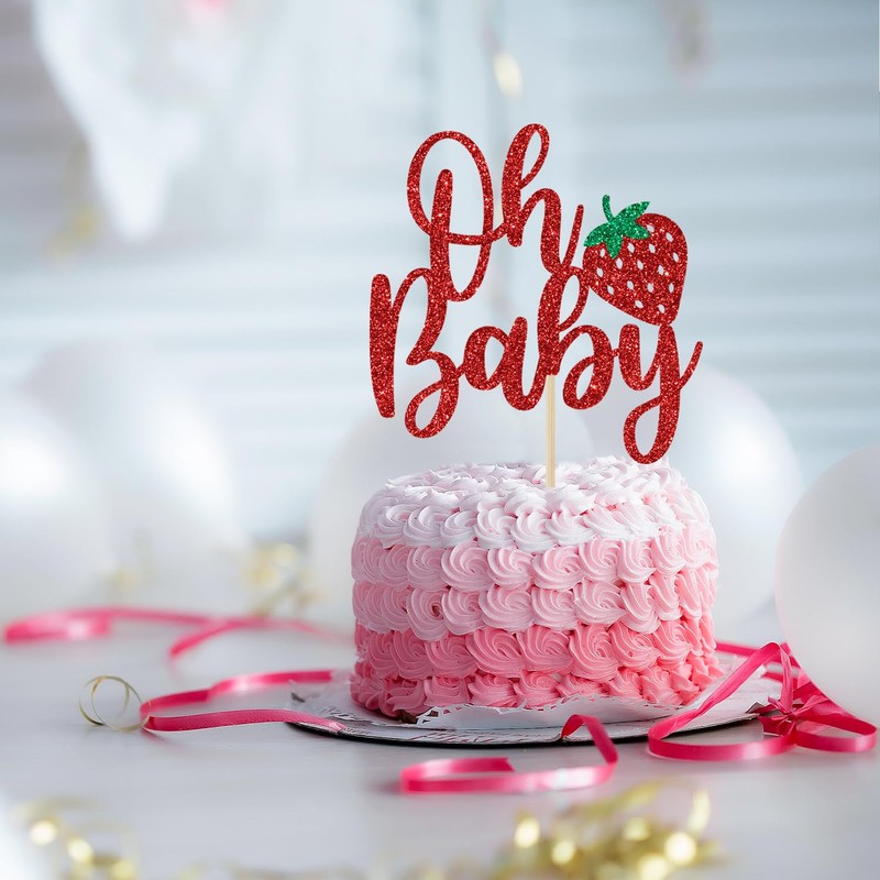 Fresa Oh - Decoración para tartas de bebé, fresa para baby shower, dulce, temática de frutas, decoración de fiesta de baby shower, purpurina roja