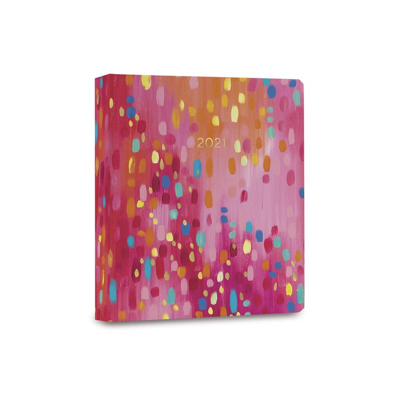 - Durable, hardcover planner in a large 7" wide x 8.5" tall format with gold foil embellishment on the cover, wire binding, a color-coordinated elastic closure, laminated month tab dividers, and a handy pocket