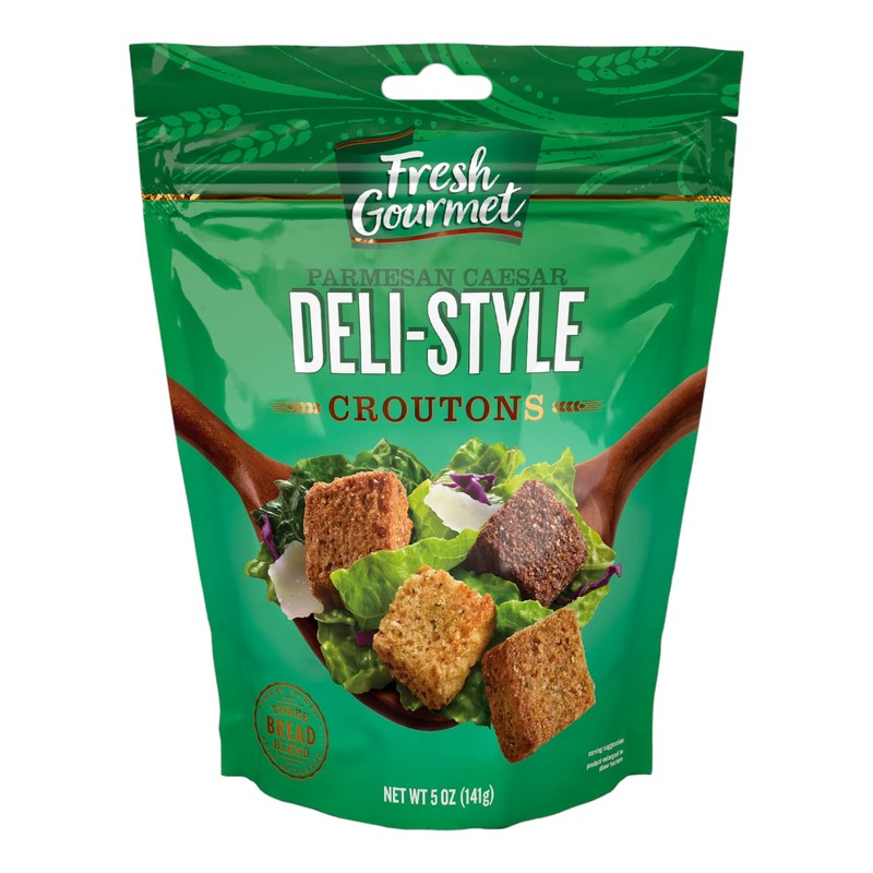 - Our Fresh Gourmet premium croutons deli-style parmesan caesar flavor, comes in 5 Ounce (Pack of 6). Always made from fresh baked bread. Also comes in classic caesar, country ranch, garden herb and many more flavor