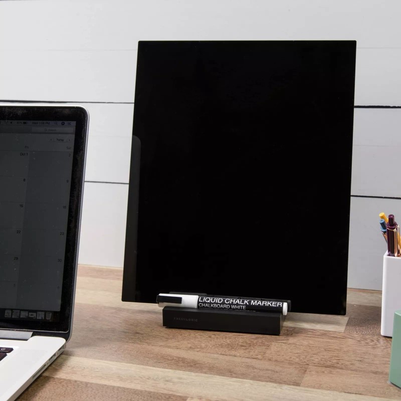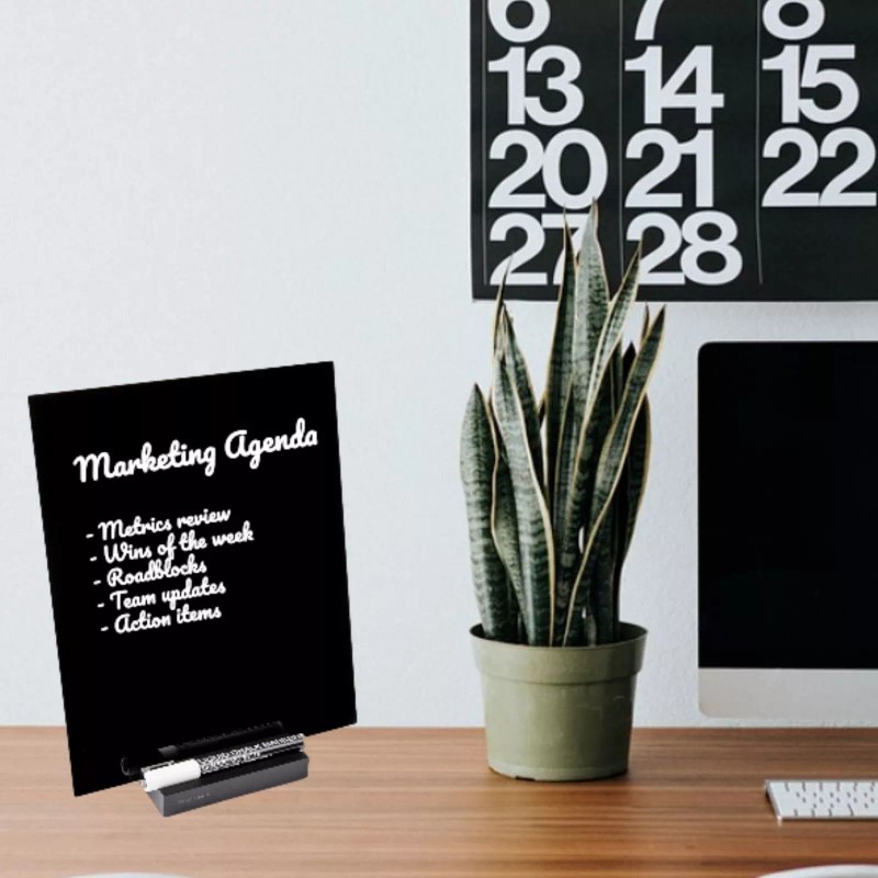 - STURDY CONSTRUCTION: Crafted from premium acrylic, our board boasts a sturdy base (5"x5") with a built-in slot for perfect angle placement. The marker tray conveniently cradles your dry erase marker, postcards, invitations, and more. Standing at a gentle angle on the included lucite tabletop stand, the 10" x 12" acrylic slate adds a modern touch to any workspace.