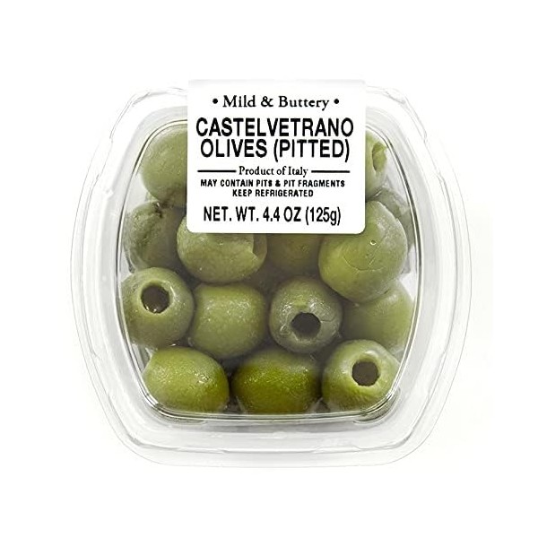 - Ingredients: Castelvetrano olives (pitted), sunflower oil, salt, ascorbic acid. Produced in a facility that processes milk and tree nuts.