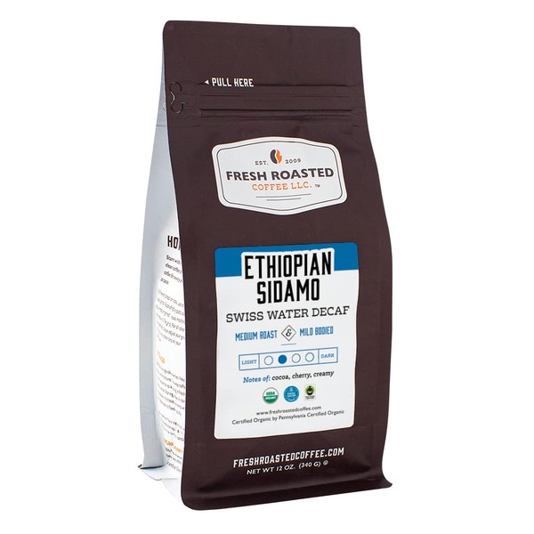 Fresh Roasted Coffee, Fair Trade Organic Ethiopian Sidamo Water Decaf, 12 oz, Kosher, Medium Roast, Ground