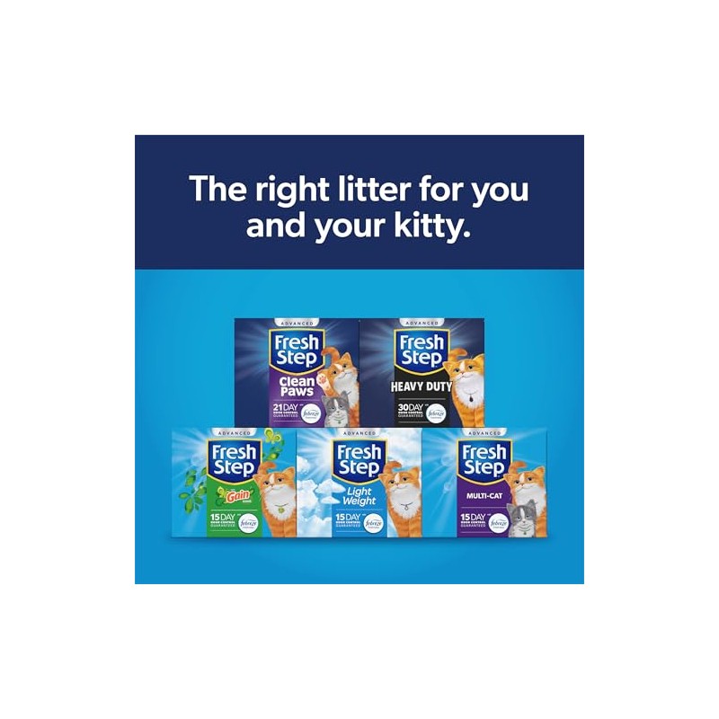 Help keep your cat's paws and your home clean with Fresh Step Clean Paws Advanced Multi-Cat Litter. Made using a special blend of larger particles, this low-tracking Fresh Step Clean Paws Cat Litter is designed to stay in the litter box and stick less to your cats fur, minimizing messes. The extra-strength clumping litter formula fights odors on contact and controls odors longer, even in homes with multiple cats (1). The power of Febreze helps neutralize even the strongest litter box smells for 10 days guaranteed (2). Cleaning the kitty litter box is fast and easy with this Fresh Step clumping cat litter that quickly absorbs liquids and forms tight clumps for effortless scooping. This Fresh Step litter has a low-dust formula for cleaner surfaces. Enjoy more catnaps and cuddle time with your kitty when you choose Fresh Step cat litter. (1) Compared to Fresh Step Clean Paws Multi-Cat (2) See package for more information on terms and conditions