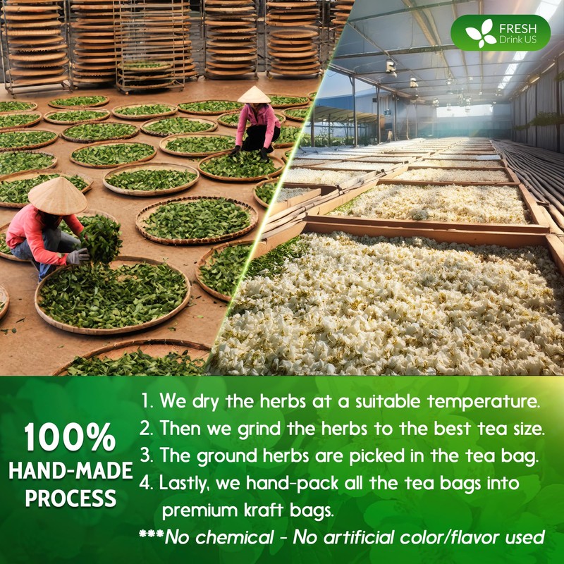 - ☘️ JASMINE GREEN TEA BAGS MADE BY A HAND-MADE PROCESS: Green Tea leaves are picked at their flavorful/colorful peak and naturally sun-dried to perfection. We scent the Green tea leaves by Jasmine flowers for the utmost quality. Then we grind the herbal leaves into the best tea size. Next, we immediately pack it in eco-friendly tea bags. Lastly, we pack the tea bags into food-grade kraft bags for ultimate freshness.