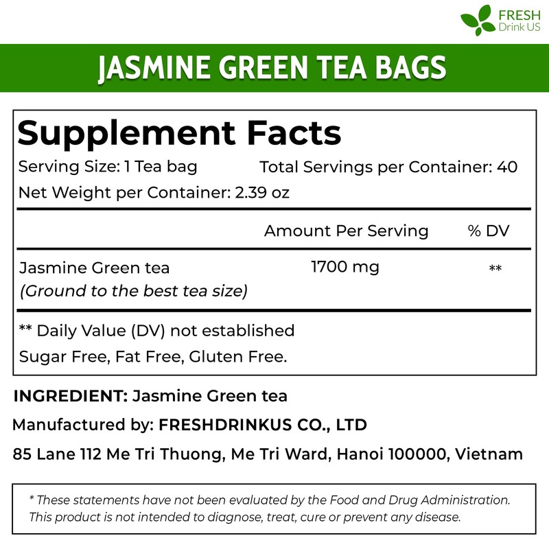 FreshDrinkUS, Premium 40 Jasmine Green Tea Bags, 100% Natural & Pure from Jasmine Green Tea. Jasmine Green Herbal Tea. Made with Natural Material Tea Bags. No Sugar, No Gluten, Vegan.