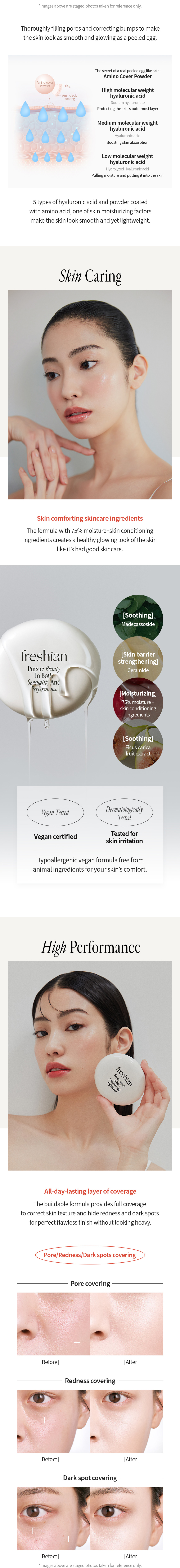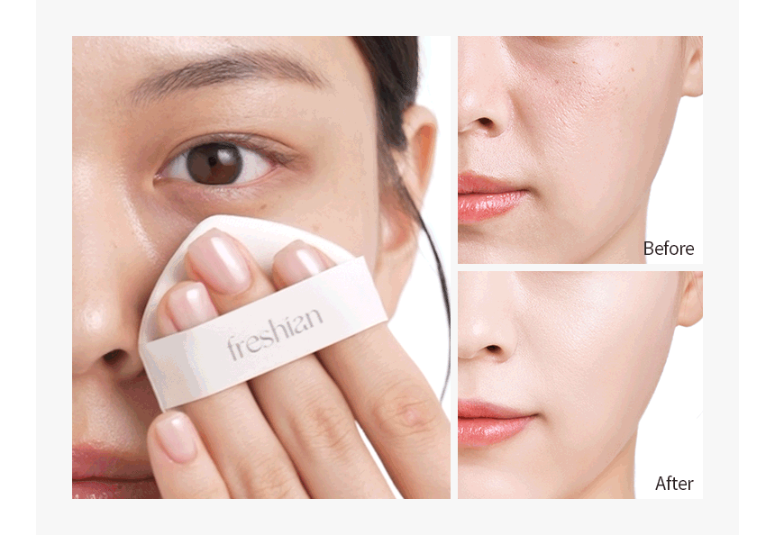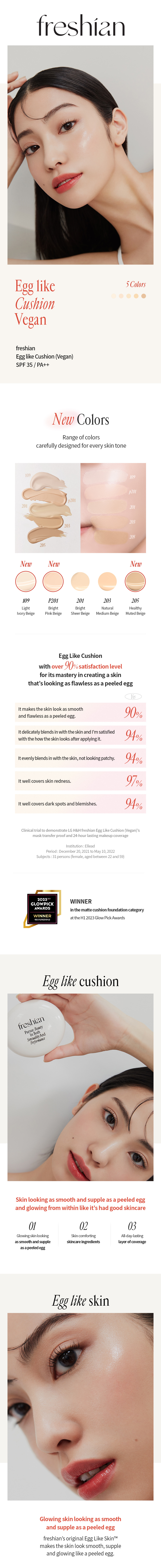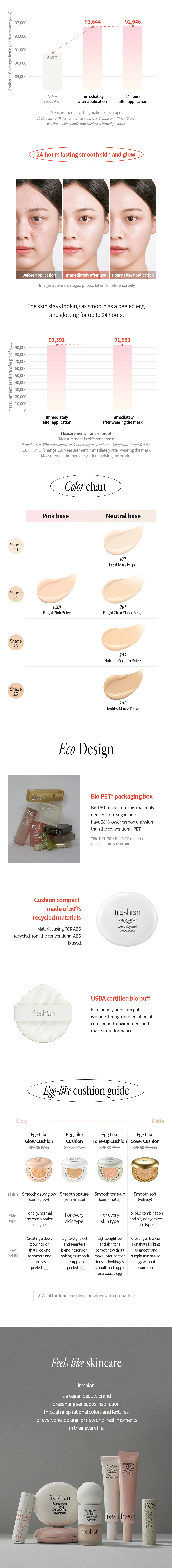 Smooth, pore-free skin accomplished with a smooth, single-layer cover. Smooth, glossy egg skin that is completed with freshian's unique egg-like skin technology. Watery formula layers one by one on my skin and creates a clean and clear skin without wrinkles. The Egg shape with a sleek design and no excess brings a unique appeal, and allows for the fresh delight of expressing my own sensibility and aesthetics in an everyday carried cushion turned object. Experience a light skin expression and natural coverage at the same time without frustration. Keeps the skin moist and smooth while maintaining a 24-hour cover without worrying about collapse. With a touch-proof formula that leaves minimal smudges on the mask, it maintains smooth and flawless skin all day long. Experience the ultra-tight texture that adheres tightly to the skin with Power Technology implementation. This is a product that contains a non-animal-derived formula and has undergone skin irritation testing. Biopet, made from raw materials derived from sugarcane, uses biopet trays that emit 28% less carbon than traditional pet trays. The cushion external container uses 50% recycled materials and is an eco-friendly premium puff made from fermented corn, considering both environment and performance.