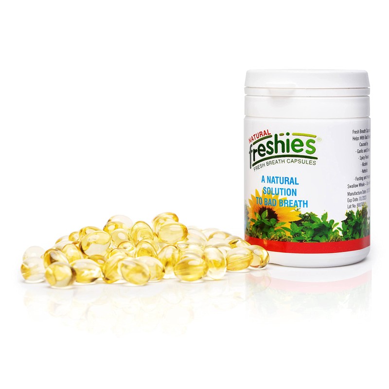 - Enjoy Food and Drinks with Peace of Mind … With Freshies backing you up, you can enjoy spicy food, garlicky food, and drink coffee or alcohol without worrying about bad breath. A single capsule maintains fresh breath for up to 3 hours. If you experience a subtle burp with pine scent, that means it's working.