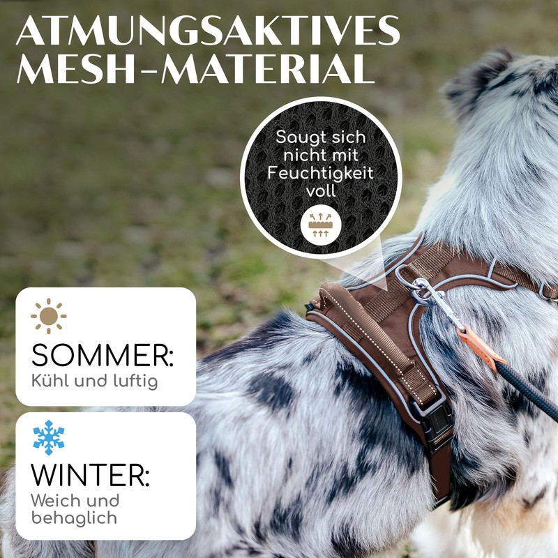 - Anti-pull function: this no-pull dog harness / anti-pull dog harness is specially designed to reduce pulling on the lead. An additional ring on the front allows the leash to be attached to the dog's chest area. When your dog pulls, it is gently steered to the side, which naturally reduces the pulling behaviour. At the same time, the harness distributes pressure evenly across the chest and shoulders, so there is no unpleasant choking. Ideal as a Y-harness or anti-pull harness for dogs that need to be guided safely and relaxed.