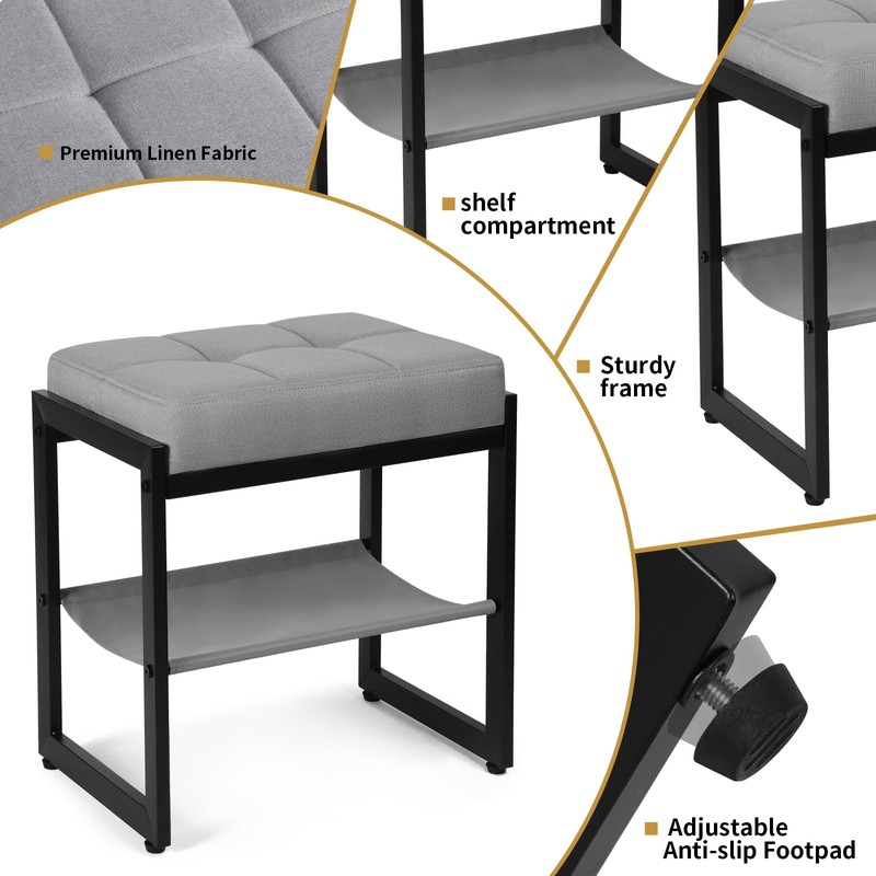 FrexCheng Vanity Stool, Linen Fabric Footstool, Bench with Storage Shelf, Makeup Dressing Stool for Dressing Table, Living Room, Bedroom,Grey&Black