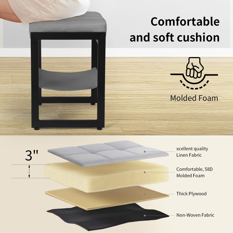 - Stylish Vanity Stool Design: This vanity stool features a modern minimalist style with a gray linen cushion and black metal legs, making it the perfect addition to any bedroom, makeup vanity, or living space.