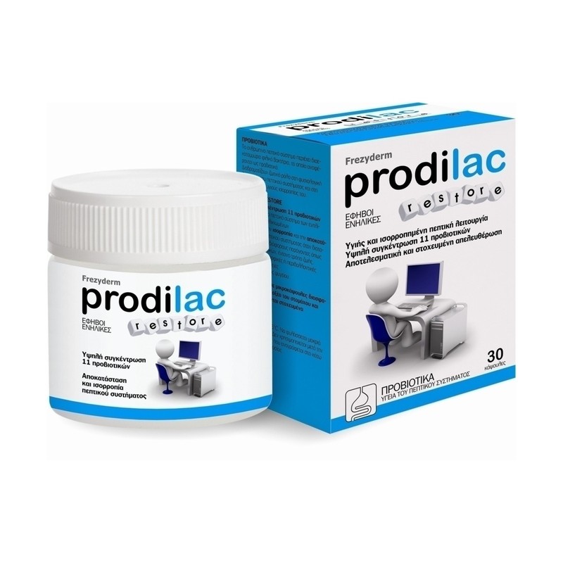 | 1 Prodilac Restore capsule contains: In total min. 5Χ108 viable Bifidobacterium bifidum, Bifidobacterium longum, Bifidobacterium lactis, Lactobacillus acidofilus, Lactobacillus rhamnosus, Lactobacillus plantarum, Lactobacillus salivarius, Lactobacillus casei, Lactobacillus bulcaricus, Lactococcus lactis, Streptococcus Thermophilus bacteria