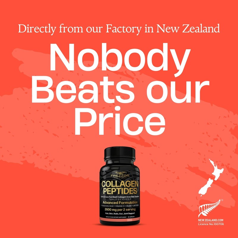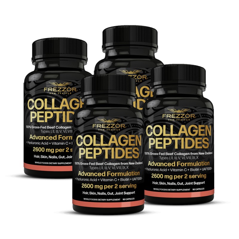 FREZZOR Collagen Peptides with UAF1000+, 100% Grass-Fed New Zealand Cattle Source, Hydrolyzed, Joint, Skin, Hair & Nail Support, Amino Acids, Anti-Aging, 360 Capsules, 4 Bottles