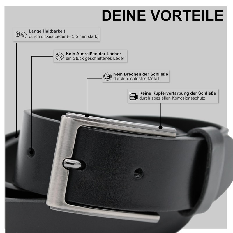 - Genuine leather: particularly sturdy leather belt made from one piece of genuine leather. This men's black leather belt made from a 3-4 mm thick leather is characterised by its special resilience - designed for many years.