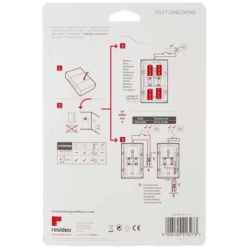 - Powered by transformer 8 V(1A) (for example Honeywell Home D753 or D780) or batteries (4 x 1.5 V LR14)