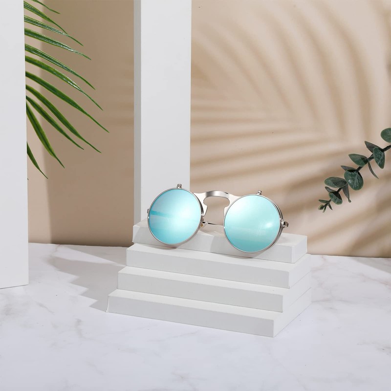 - Flip Up & Silver Frame The circle sunglasses have a flip up design. You can simply flip up the lens instead of putting the steampunk sunglasses on your head. The silver retro frame makes you look elegant and fits 70s themed parties