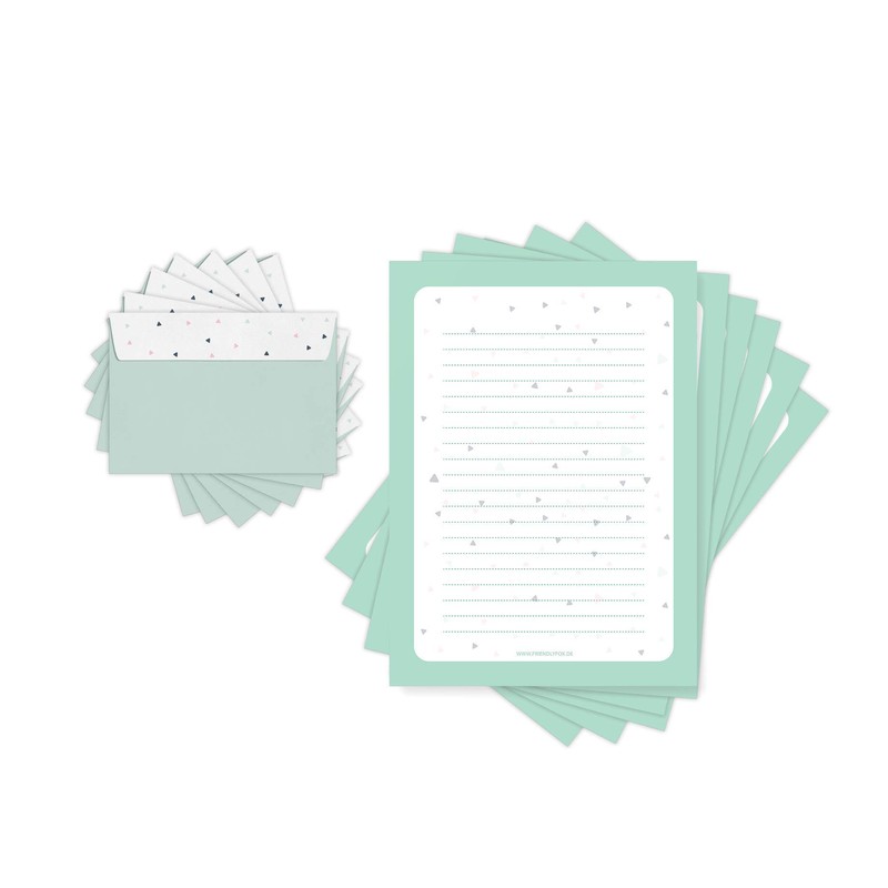 - Writing letters: the mint-coloured writing paper has the format DIN A4, is printed on one side and lined.