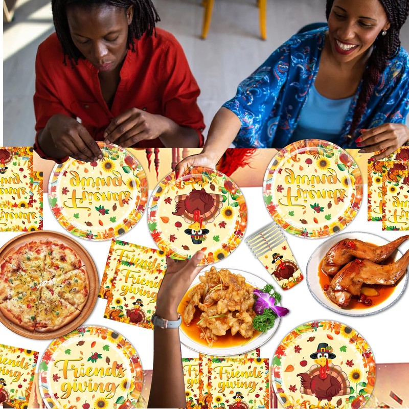 Friendsgiving Party Tableware Sets,Happy Friendsgiving Party Supplies Paper Plates and Napkins Set Includes Paper Plates Napkins Paper Cups Tablecover for Fall Friendsgiving Party Decorations