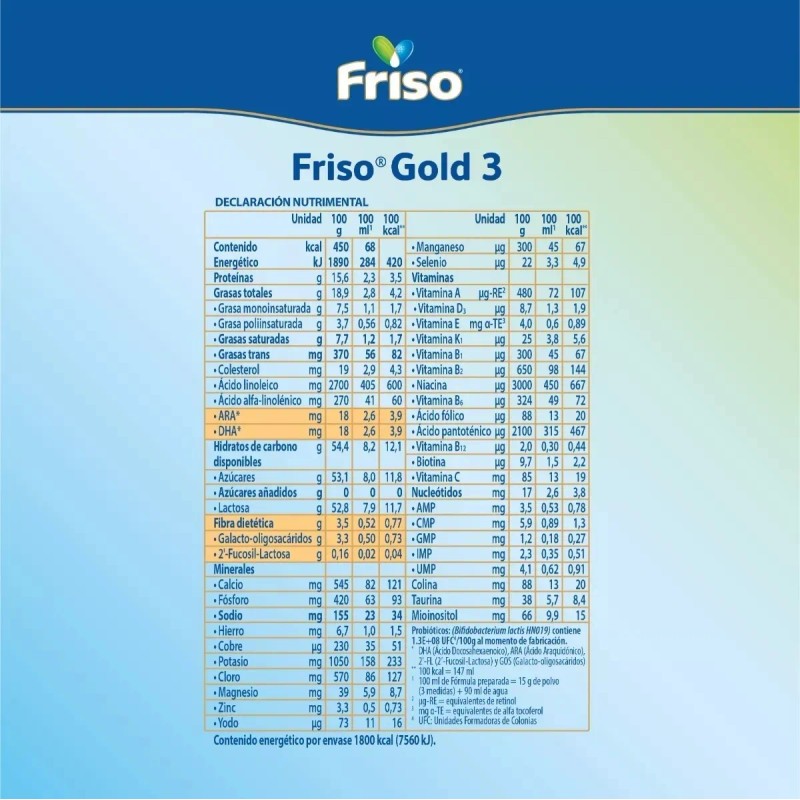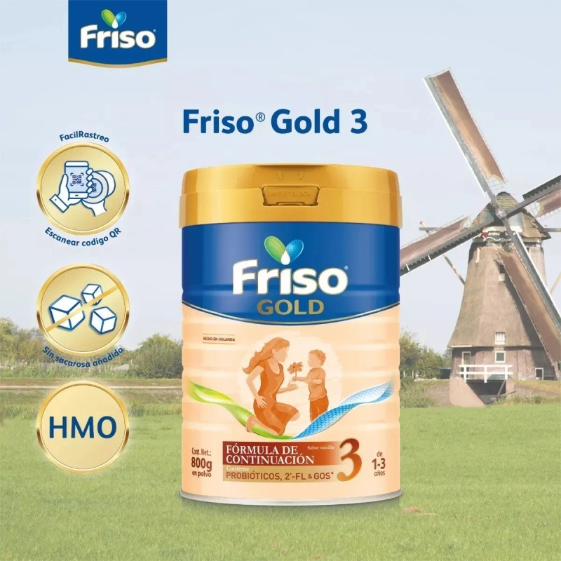 Formulada con nutrientes esenciales como DHA, prebióticos, vitaminas y minerales, Friso Gold 3 ayuda a fortalecer las defensas naturales, promover una buena digestión y apoyar el desarrollo cognitivo. Su fórmula suave y de fácil digestión está pensada para complementar la alimentación diaria del niño, brindándole energía y salud.