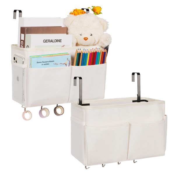 Frjjthchy Bedside Storage Organizer 5 Pockets with 4 Hooks Hanging Storage Bag for Headboards/Bunk Bed (2Pack White)