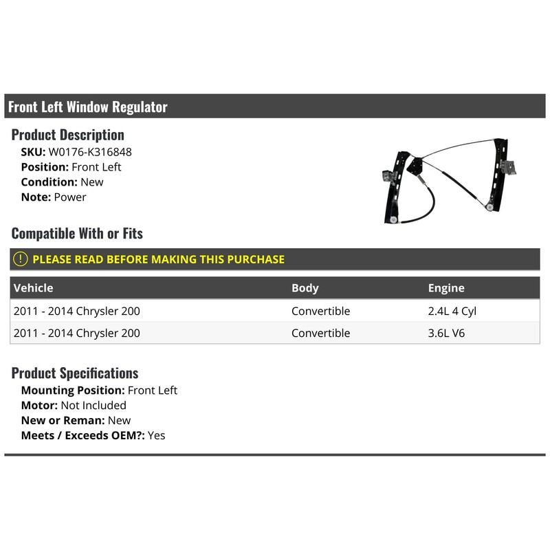 Front Left Driver Side Power Window Regulator - Compatible with 2011-2014 Chrysler 200 Convertible