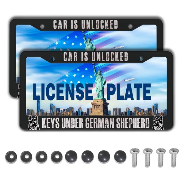 Front License Plate Bracket Black and White License Plate Frames Car is Unlocked Keys Under German Shepherd Universal Aluminum Car Accessory 2 Pack with Screw Covers Set