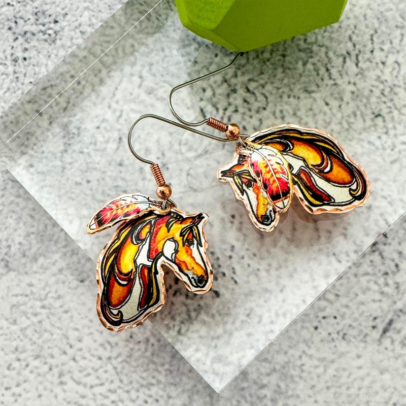 - Beautiful horse earrings painted pony jewelry are embellished with red hawk feathers. This feather jewelry presents a native flair with layered horse earrings, unique horse gifts