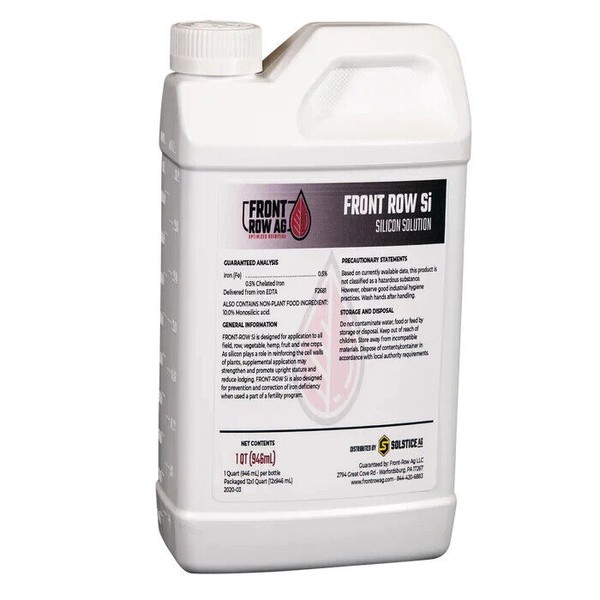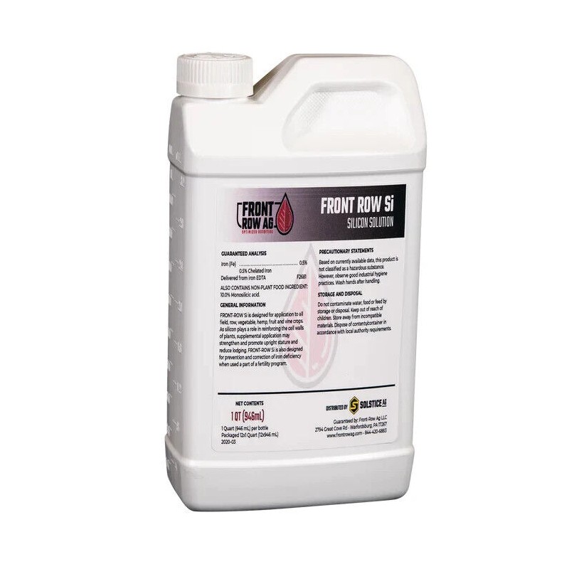 Front-Row Si's formulation uniquely rectifies precipitate issues with a proprietary technology that stabilizes mono- & di- silicic acid allowing for the delivery of unmatched concentrations. The stabilization elements are fully metabolized by the plant without issue and leave zero residues. It maximizes solubility with uniquely chelated iron that balances silicic acids to reduce risk of precipitates