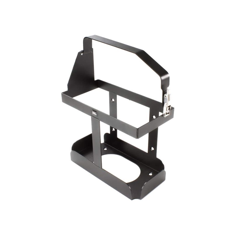 This Vertical Jerry Can Holder offers a smart no rattle no wear solution to transport much needed fuel on any adventure or the path less traveled. Features an adjustable stainless steel latch with safety catch holds your Jerry Can firmly in place over a lifetime of off-road abuse. Use with 20l / 5.3 gallon NATO/Wedco style military cans. Not suitable for Scepter style containers. This strap covers the Jerry Can cap. Add your own padlock and you'll never have to worry about stolen fuel while on the road. Made of black powder coated stainless steel. Not Suitable for Roof Rack fitment. Not suitable for Scepter style containers.