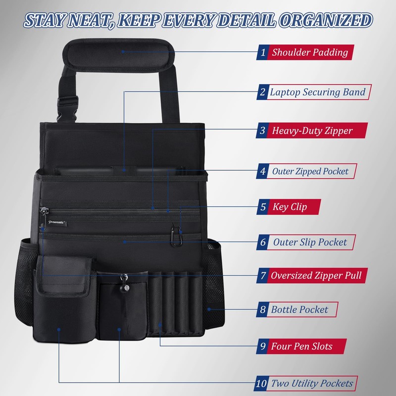 - Large Storage Space: Features a 17" x 5" padded section for laptops up to 18", space for up to 3 ring binders with a mesh divider, and a zippered pocket for important documents. Also includes an outer slip pocket, 2 bottle holders, 2 small utility pockets, and 4 pen slots.An ideal addition to your car accessories collection for organized ride!