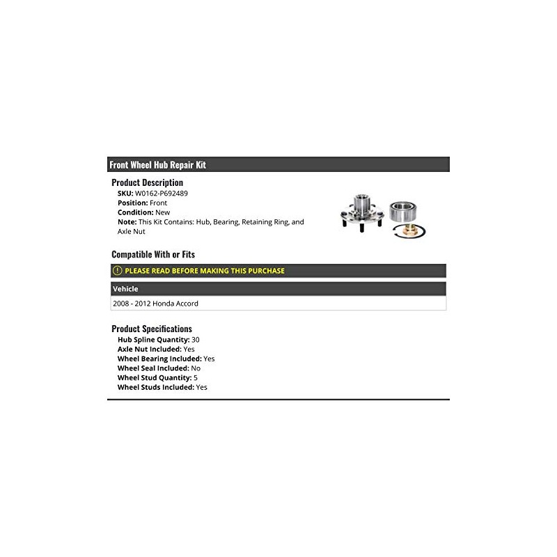 Front Wheel Hub and Bearing Repair Kit - with Retaining Ring and Axle Nut - 5 Stud - Compatible with 2008-2012 Honda Accord
