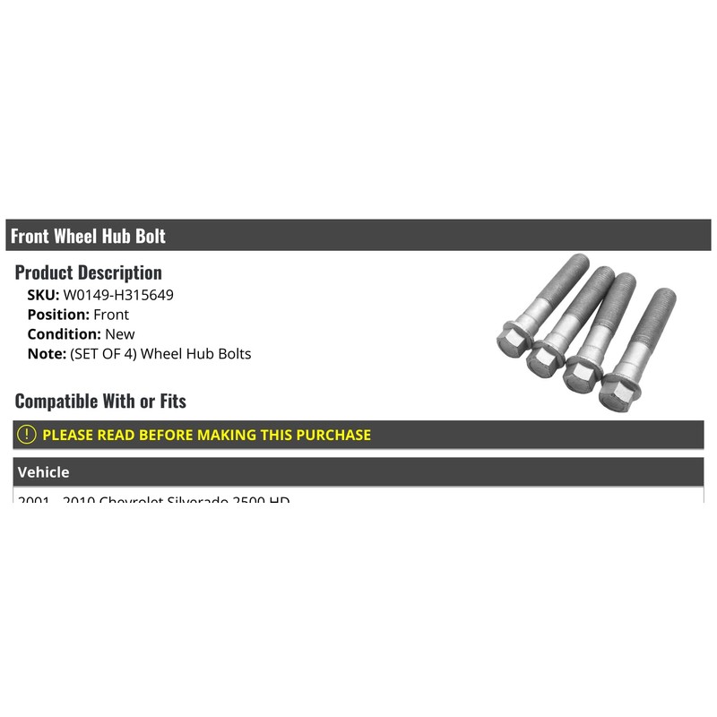 Front Wheel Hub Bolts - 4 Piece - Compatible with 2001-2010 Chevy Silverado 2500 HD