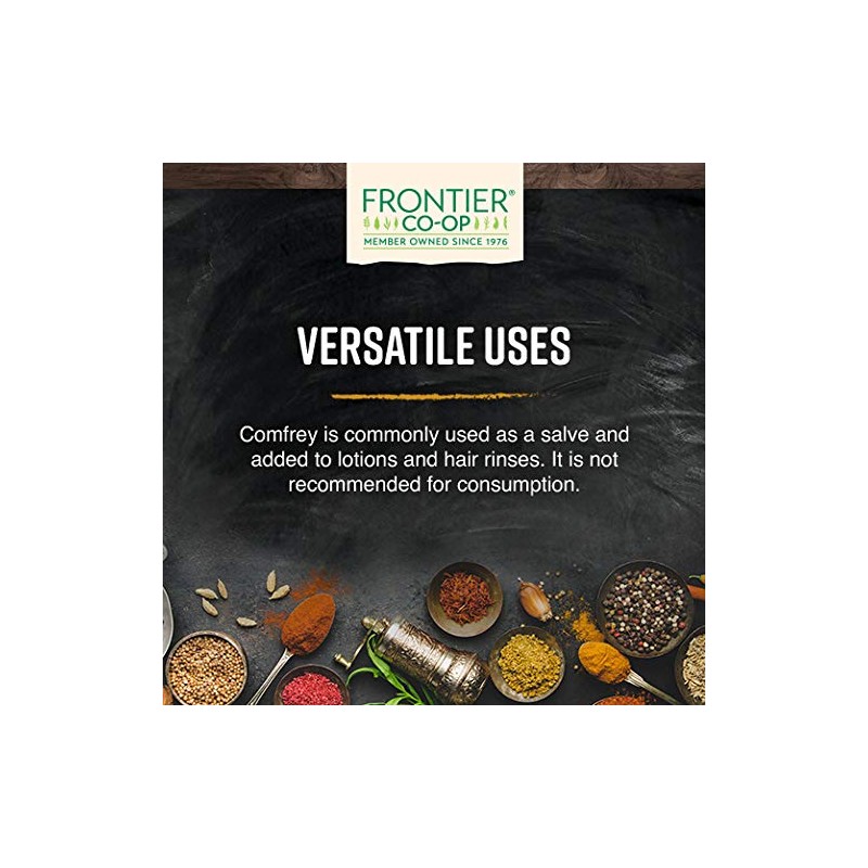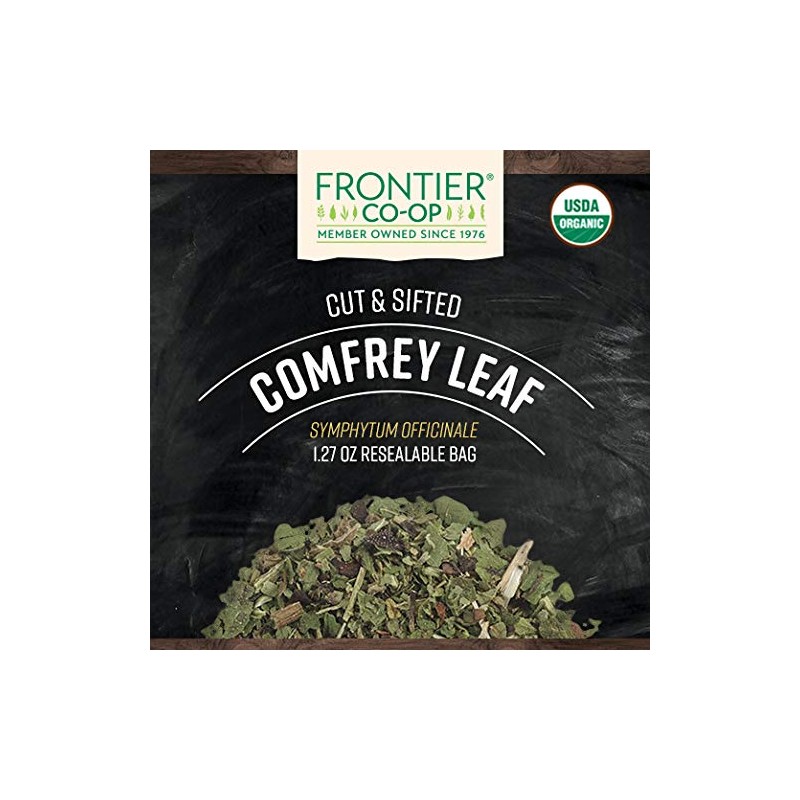 Comfrey is a perennial herb most often used in various cosmetic products. Our comfrey leaves are certified organic, kosher, and non-irradiated. The leaves are not recommended for consumption.Best uses:Lotions, creams, skincare productsFEATURES- 1.27 ounces (36 grams)- Resealable stand-up bag- Organic certified, kosher certified, and non-irradiated- Known for promoting good soil conditions- Botanical name: Symphytum officinale