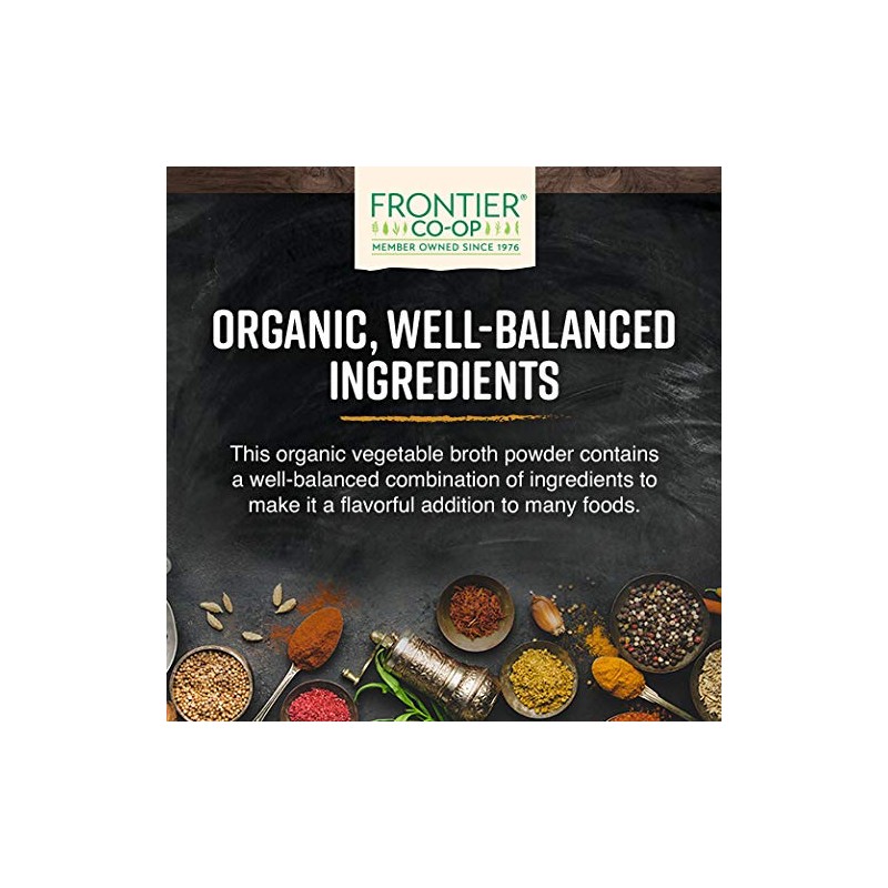 - CONVENIENT BROTH POWDER – Frontier Co-op Organic Vegetable Flavored Broth Powder is an incredibly convenient, low-sodium powder used for many foods. Simply mix four teaspoons of broth powder with 8 ounces of boiling water. Simmer for 1-2 minutes and you have a ready-to-use vegetable broth!