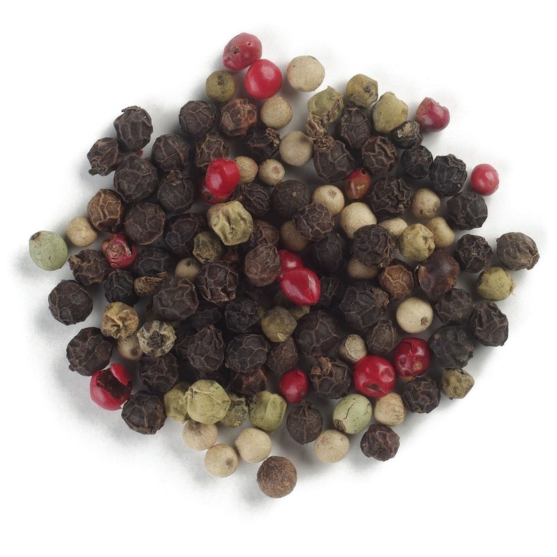 * 1 pound bulk bag (16 ounces) * Kosher certified, non-irradiated * Colorful and flavorful * Grindable for many individual foods (meat, chicken, and more) * Botanical names: Piper nigrum L. (black, white, and green peppercorns), Schinus terebinthifolius Raddi and Sch. molle L. (pink peppercorns)