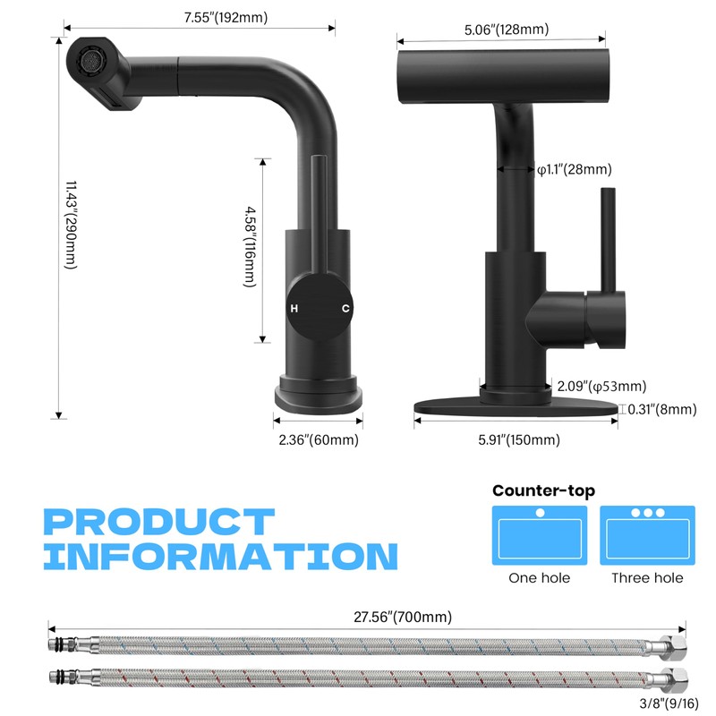 This black bathroom sink faucet with 360° rotatable faucet body pipe and 24” extended pull-out hose provide maximum flexibility, making cleaning in hard-to-reach spaces a breeze.