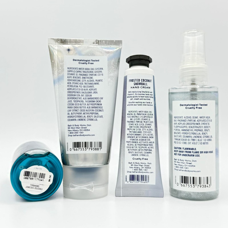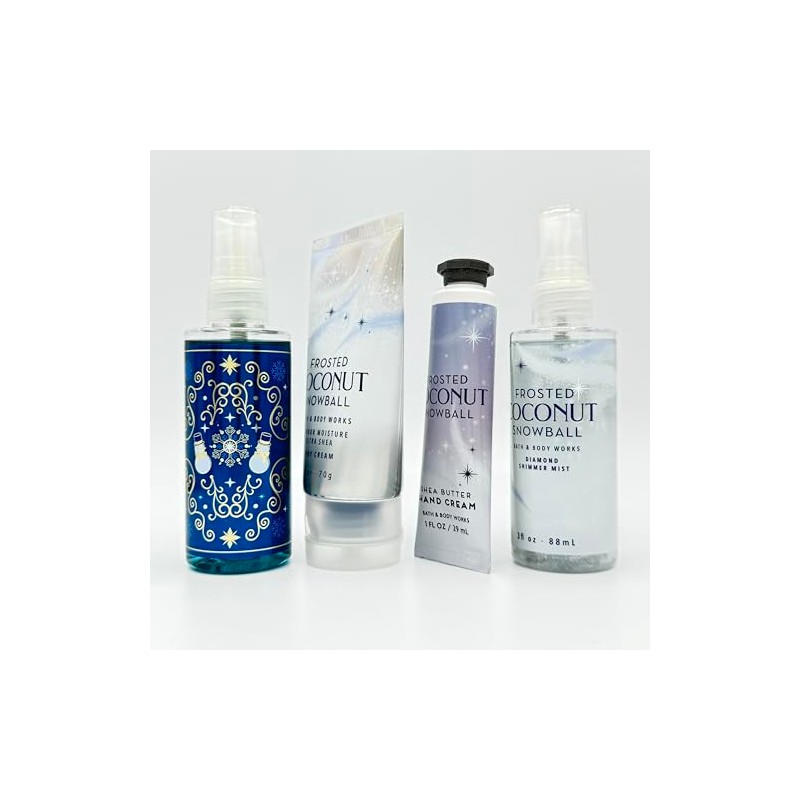 - Frosted Coconut Snowball 4-Piece TRAVEL SIZE Bath Bundle | Body Mist, Body Cream, Hand Cream and Diamond Shimmer Mist.